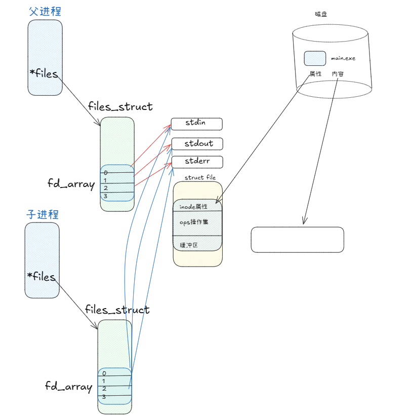 此时创建子进程:现在问题是,父进程打开的文件流还需要给子进程整体拷贝一份吗?不需要,因为左边是进程,右边是文件管理,并且我们还有一个叫做写时拷贝的机制。此时父子进程共享资源——类似于浅拷贝的机制。现在的状态如下: