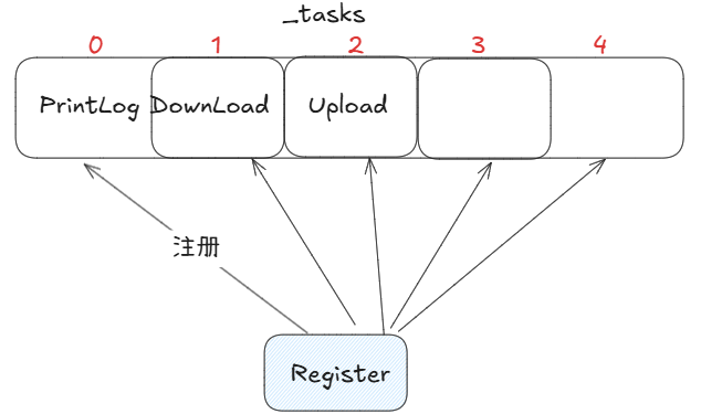 public:TaskManager(){srand(time(nullptr));} //注册任务函数到tasks表中void Register(task_t t){_tasks.push_back(t);}//生成随机任务码int Code(){return rand() % _tasks.size();}//执行任务void Execute(int code){if(code >= 0 && code < _tasks.size()){_tasks[code]();}}~TaskManager(){}