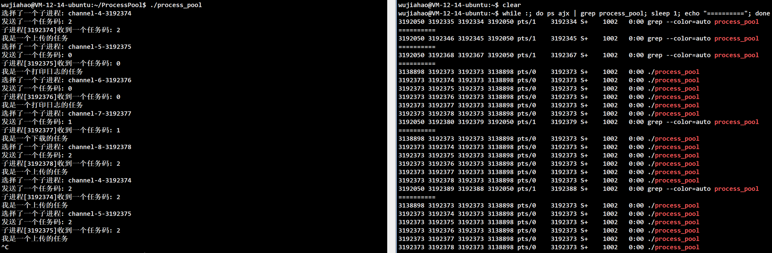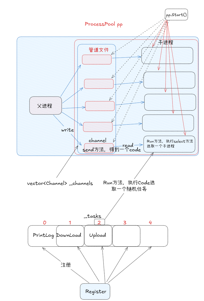 public:ProcessPool(int num) : _process_num(num){ //用任务管理类注册一些方法用于分发给子进程_tm.Register(PrintLog);_tm.Register(Download);_tm.Register(Upload);}void Work(int rfd){while (true){int code = 0;ssize_t n = read(rfd, &code, sizeof(code));if (n > 0){if (n != sizeof(code)){continue;}std::cout << "子进程[" << getpid() << "]收到一个任务码: " << code << std::endl;//成功读到任务码,执行任务_tm.Execute(code);}//n==0时,代表读到管道文件结尾,else if (n == 0){std::cout << "子进程退出" << std::endl;break;}else{std::cout << "读取错误" << std::endl;break;}}}bool Start(){for (int i = 0; i < _process_num; i++){// 1. 创建管道int pipefd[2] = {0};int n = pipe(pipefd);if (n < 0)return false;// 2. 创建子进程pid_t subid = fork();if (subid < 0)return false;else if (subid == 0){// 子进程// 3. 关闭不需要的文件描述符。子进程读,所以关闭写端close(pipefd[1]);//子进程执行读取到的任务码Work(pipefd[0]); //??//执行完后关闭流,退出close(pipefd[0]);exit(0);}else{// 父进程// 3. 关闭不需要的文件描述符,父进程写端,所以关闭读端close(pipefd[0]); // 写端:pipefd[1];_cm.Insert(pipefd[1], subid);// wfd, subid}}return true;}void Debug(){//打印所有子进程_cm.PrintChannel();}void Run(){// 1. 选择一个任务int taskcode = _tm.Code();// 2. 选择一个信道[子进程],负载均衡的选择一个子进程,完成任务auto &c = _cm.Select();std::cout << "选择了一个子进程: " << c.Name() << std::endl;// 2. 发送任务c.Send(taskcode);std::cout << "发送了一个任务码: " << taskcode << std::endl;}void Stop(){// 关闭父进程所有的wfd即可_cm.StopSubProcess();// 回收所有子进程_cm.WaitSubProcess();}~ProcessPool(){}private:ChannelManager _cm;int _process_num;TaskManager _tm;