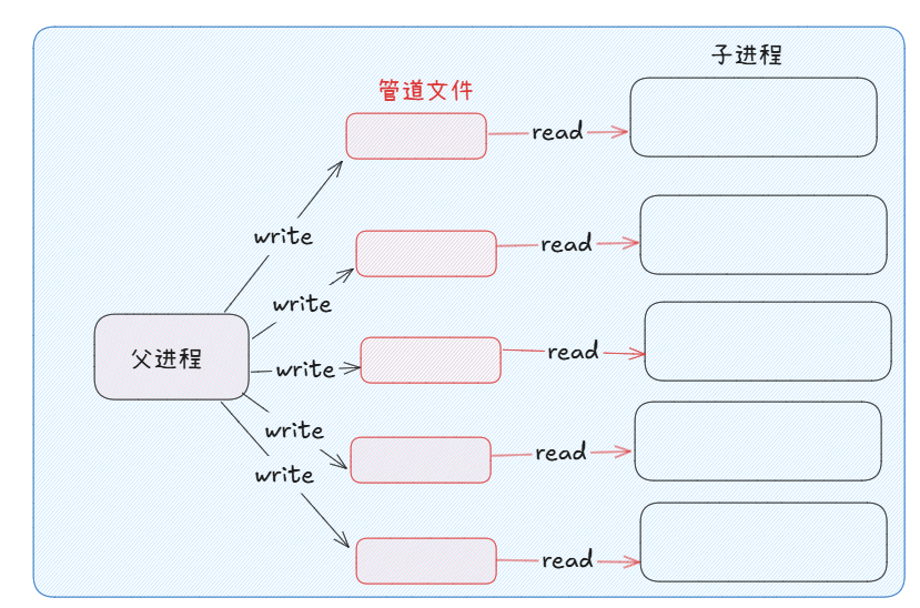 基于我们现有的知识,我们可以写一个基于匿名管道的进程池:一个父进程写端,多个子进程读端,每个子进程根据管道文件中读到的内容执行不同的任务。