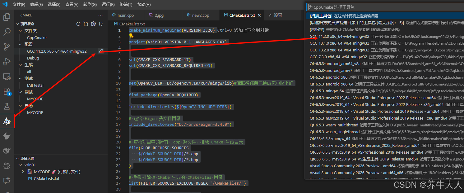 set(CMAKE_CXX_STANDARD_REQUIRED ON)set(OpenCV_DIR D:/opencv4.10/x64/mingw/lib)#库路径你自己换成你电脑上的find_package(OpenCV REQUIRED)include_directories(${OpenCV_INCLUDE_DIRS})# 包含 Eigen 头文件目录