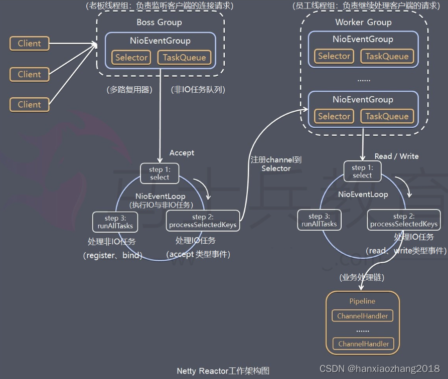 - Netty服务端启动时,创建了两个NioEventLoopGroup,它实际是两个独立的线程池。一个用于接收客户端的TCP连接(Boss),另一个用于处理IO相关的读写操作,或者执行系统Task、定时任务Task等(Work)。