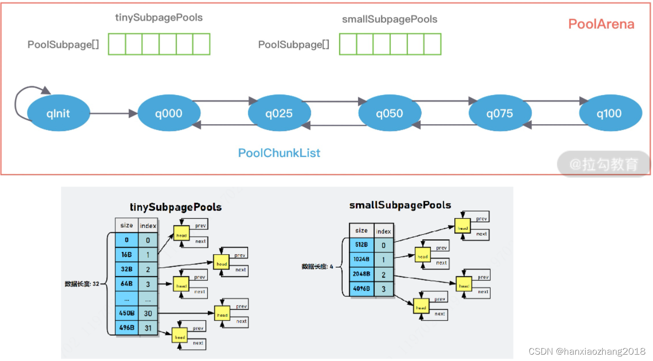 - 分配内存小于8K时,由PoolSubpage负责管理的内存分配策略。
