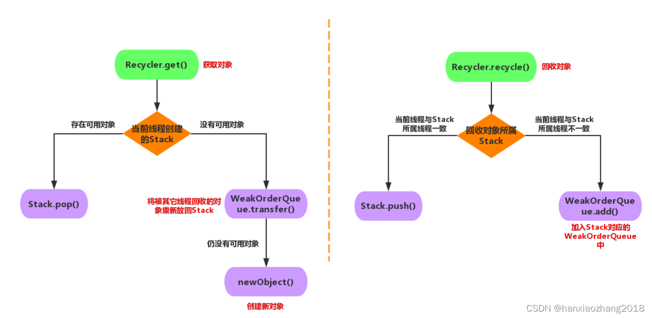 - DefaultHandle:对象的包装类,在Recycler中缓存的对象都会包装成DefaultHandle类。