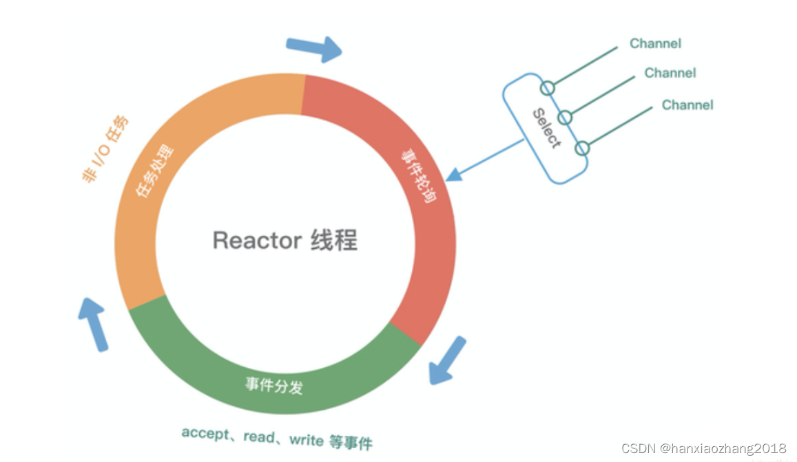 - 连接注册:Channel建立后,注册到Reactor线程的Selector中。