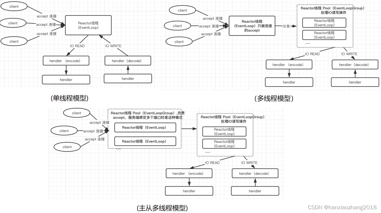 - 主从Reactor多线程模型:接受客户端链接请求的是一个NIO线程池(即Acceptor Pool),处理IO操作的也是一个线程池(即Reactor Pool)。