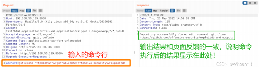 【思路】既然“git clone...”作为“Archive”的参数被服务器执行。那么,尝试使用curl注入诸如ipconfig、ifconfig和hostname等任意命令看是否被执行以探测此处的执行权限。