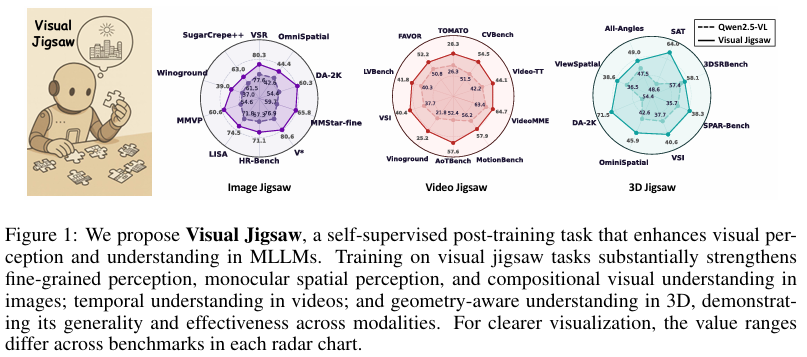 - 增强视觉理解:通过Visual Jigsaw任务,提升MLLMs在精细粒度感知、时间推理和三维空间理解等方面的能力。
