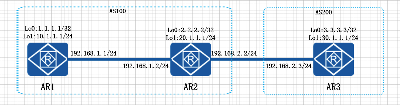 bgp router-id 2.2.2.2neighbor 1.1.1.1 remote-as 100neighbor 1.1.1.1 update-source loopback 0neighbor 192.168.2.3 remote-as 200network 10.1.1.1 mask 255.255.255.0network 20.1.1.1 mask 255.255.255.0network 30.1.1.1 mask 255.255.255.0neighbor 1.1.1.1 next-hop-selfAR3----------------------------------------------------