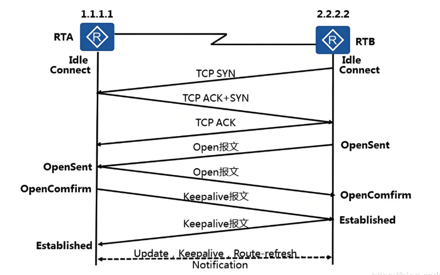 4. OpenConfirm | 收到邻居的 Open 报文后,验证参数(如 AS 号匹配),发送Keepalive 报文确认。 |