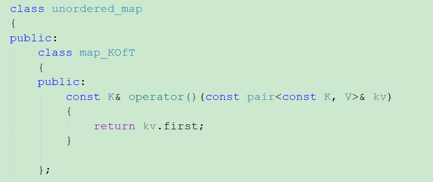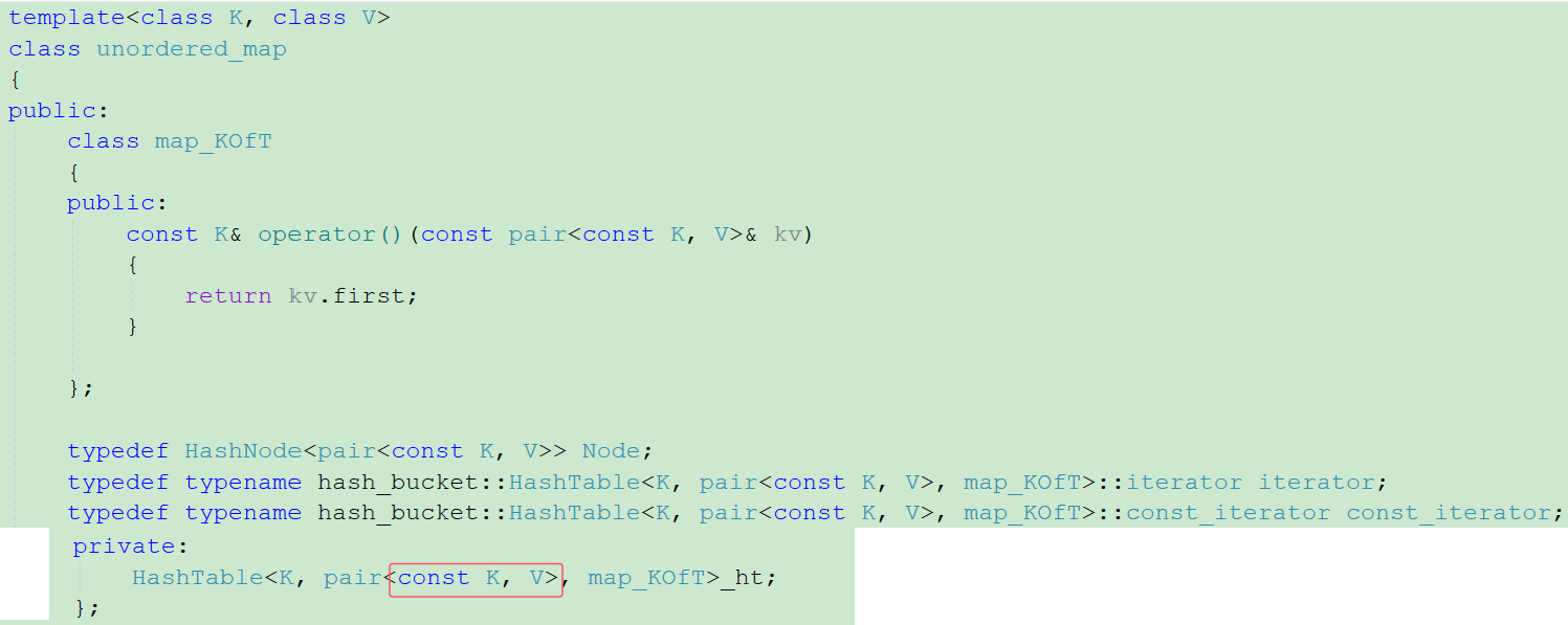 {template<class K, class V>class unordered_map{public:class map_KOfT{public:const K& operator()(const pair<const K, V>& kv){return kv.first;}};typedef HashNode<pair<const K, V>> Node;typedef typename hash_bucket::HashTable<K, pair<const K, V>, map_KOfT>::iterator iterator;typedef typename hash_bucket::HashTable<K, pair<const K, V>, map_KOfT>::const_iterator const_iterator;iterator find(const K& key){return _ht.find(key);}pair<iterator,bool> insert(const pair<K,V>& kv){return _ht.insert(kv);}V& operator[](const K key){return _ht.insert(make_pair(key, V())).first->second;}bool erase(const K& key){return _ht.erase(key);}iterator begin(){return _ht.begin();}iterator end(){return _ht.end();}const_iterator begin() const{return _ht.begin();}const_iterator end() const{return _ht.end();}private:HashTable<K, pair<const K, V>, map_KOfT>_ht;};