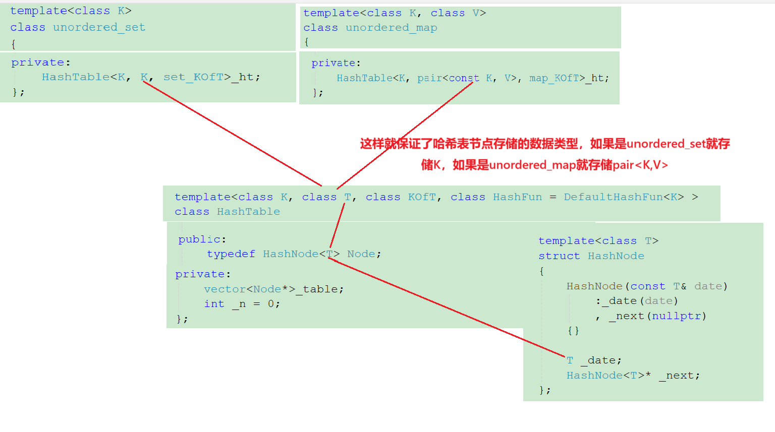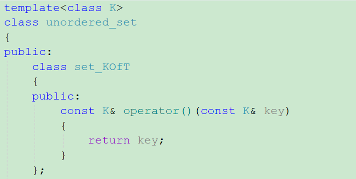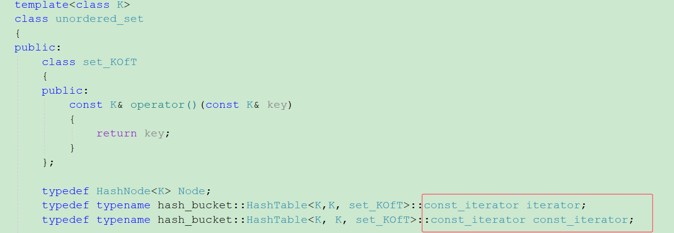 {template<class K>class unordered_set{public:class set_KOfT{public:const K& operator()(const K& key){return key;}};typedef HashNode<K> Node;typedef typename hash_bucket::HashTable<K,K, set_KOfT>::const_iterator iterator;typedef typename hash_bucket::HashTable<K, K, set_KOfT>::const_iterator const_iterator;iterator find(const K& key){return _ht.find(key);}pair<iterator,bool> insert(const K& key){pair<typename hash_bucket::HashTable<K, K, set_KOfT>::iterator, bool> ret = _ht.insert(key);return pair<const_iterator, bool>(ret.first, ret.second);}bool erase(const K& key){return _ht.erase(key);}iterator begin() const{return _ht.begin();}iterator end() const {return _ht.end();}private:HashTable<K, K, set_KOfT>_ht;};}
