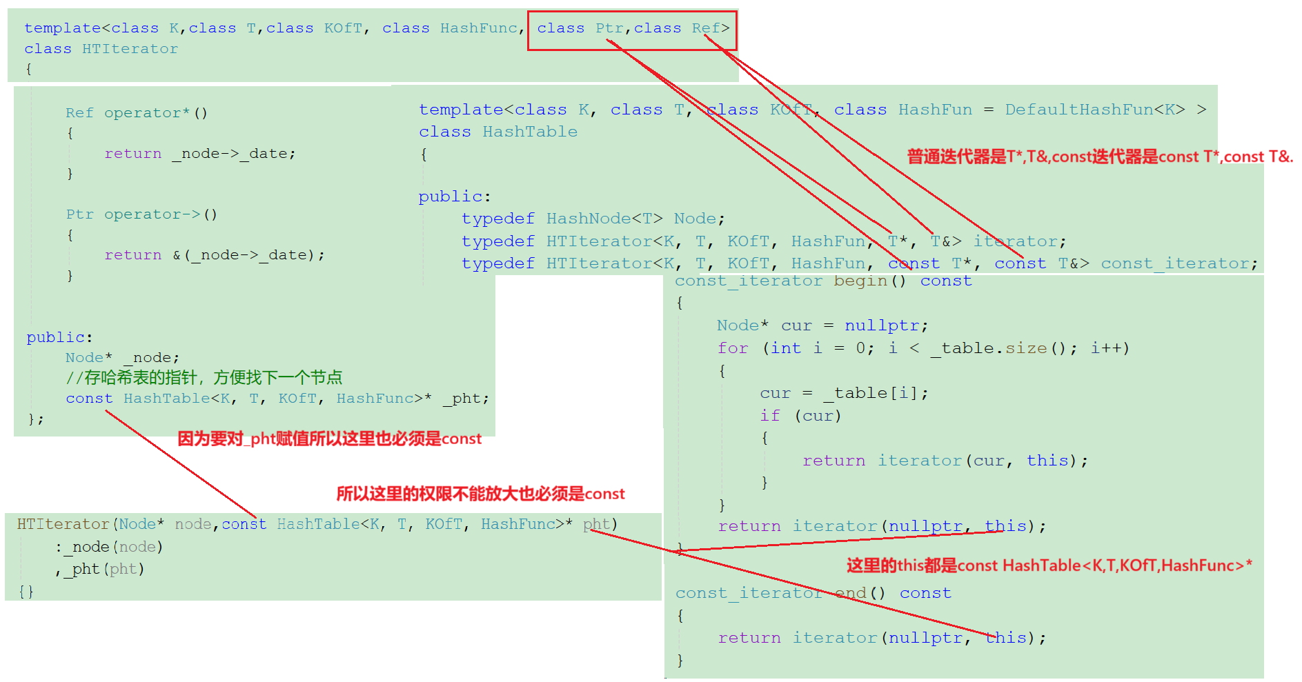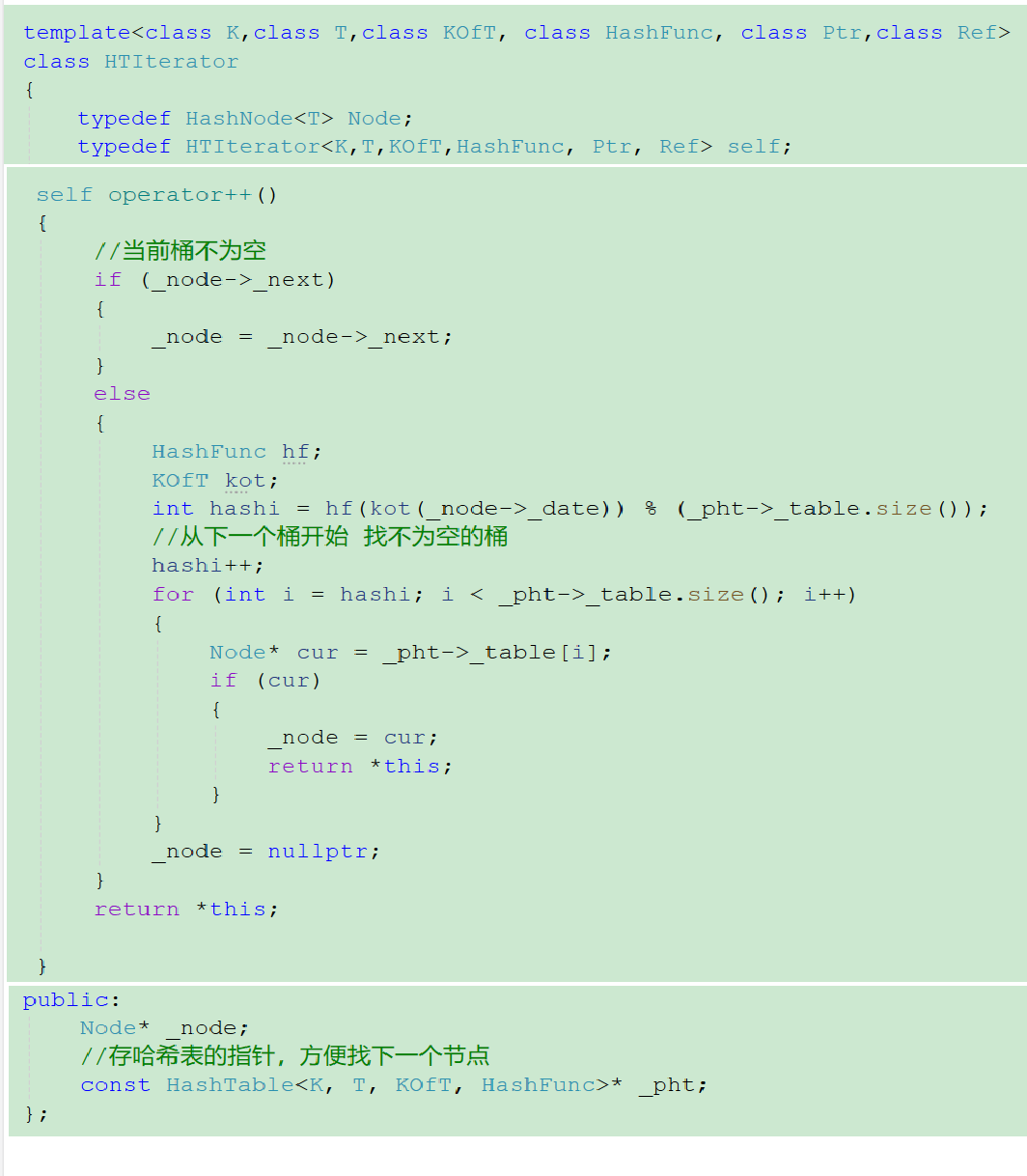 这就需要在迭代器中存储一个哈希表的指针,这个指针是由哈希表传过来的,这样我们才能在哈希表中查找下一个不为空的桶。
