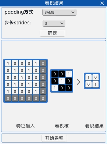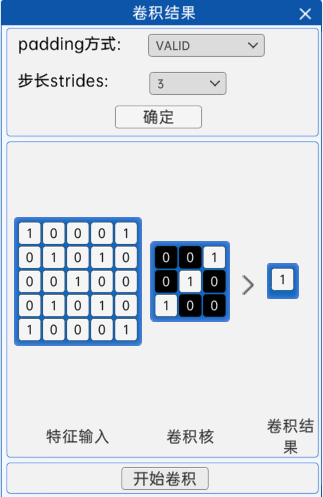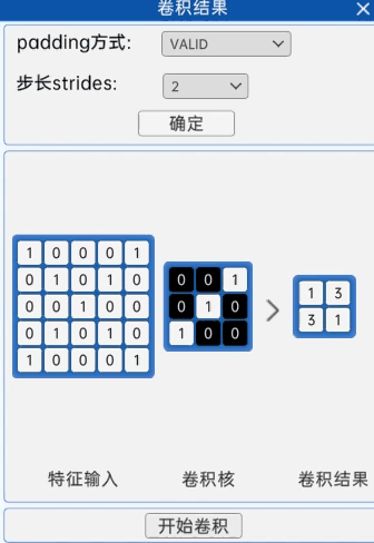 而当步长为2时,经过卷积后的结果将会是一个2x2的矩阵,如下图所示: