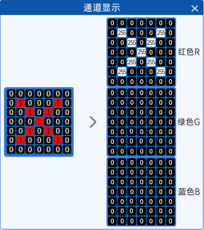 在彩色这个图像中,它分成RGB三通道之后,每个通道都有一个像素的表述,原始的彩色图是一个7*7的,横的7个像素,纵的7个像素,如果把它拆成RGB三个通道之后呢,它依然是一个7*7的像素,一共49个像素点,但是在每个像素值里面,它的范围都是0到255。那么这个彩色图它有一个红色的X,表示红色这个通道对应的位置是255,剩下的是0,而G和B通道呢,他们所有的像素点全都是0,在RGB合并的时候,可以简单的看作是所占的权重比,对于当前彩色图,红色占比最大表现出来的红色X。
