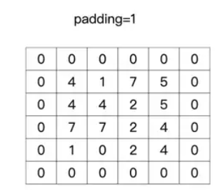 举个例子,padding 等于 1 就是补一圈的零,等于 2 就是补两圈的零,如下图所示: