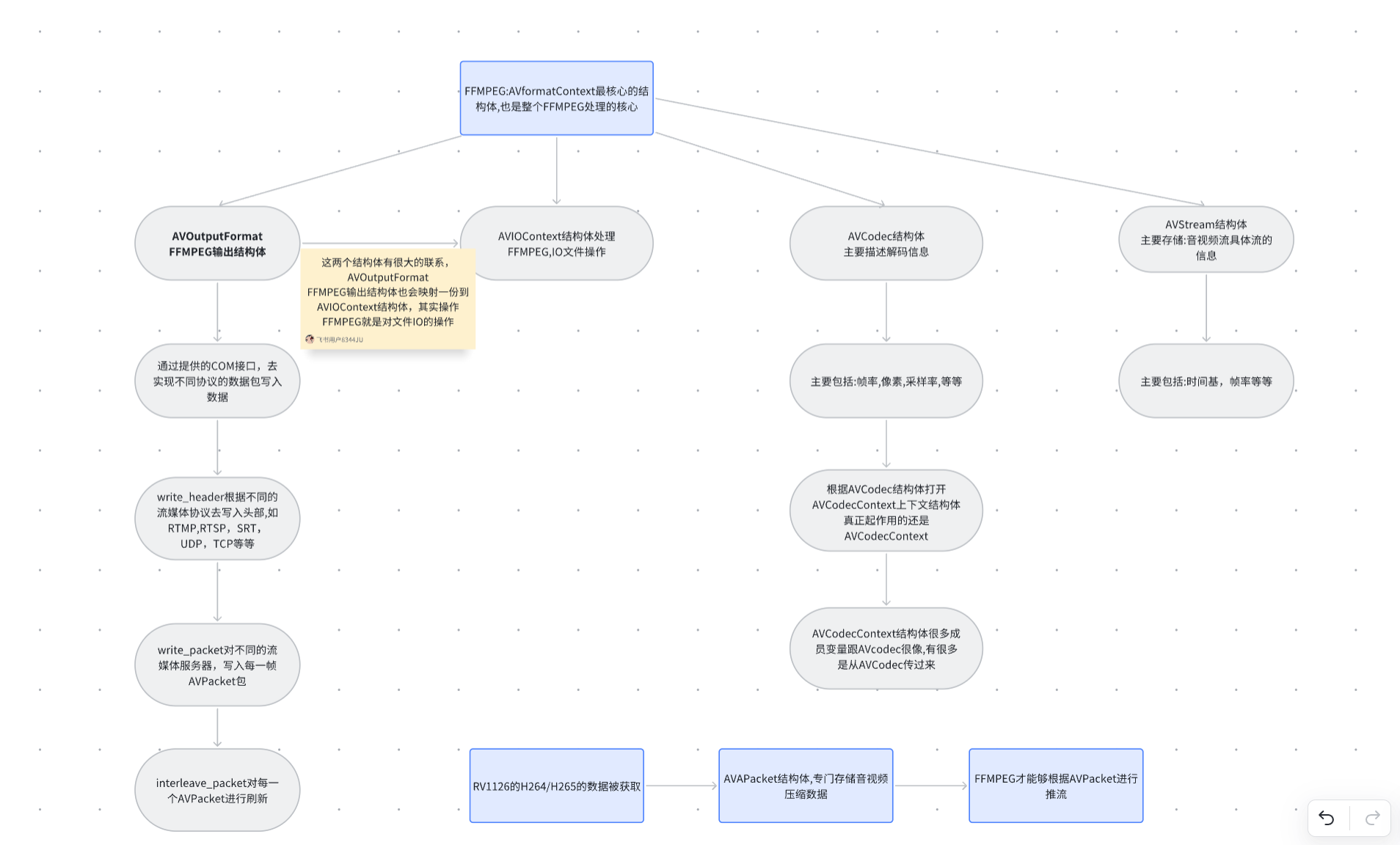本章节主要介绍FFMPEG的结构体,FFMPEG是音视频的瑞士军刀,它提供了一系列丰富的音视频处理接口。如:编码、解码、推流、滤镜等等。在我们这个项目里面,FFMPEG主要的作用是进行视频推流的功能,就是把RV1126编码的视频码流利用FFMPEG框架推送到流媒体服务器。