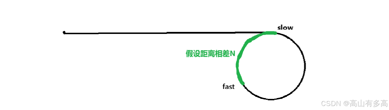 把链表的 “环” 想象成 “环形跑道”,fast 先跑进 “跑道(环)”,slow 后跑进 “跑道”。当 slow 刚进环时,和 fast 在环内有个距离差 N;由于 fast 速度是 slow 的 2 倍,相当于每走一次,fast 相对于 slow 的距离就缩短 1。