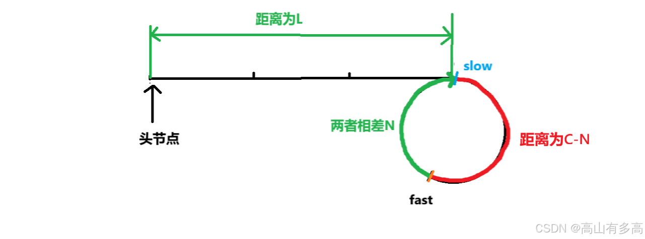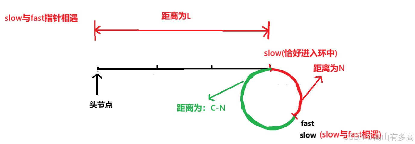 快指针的路程也可表示为 “慢指针到环入口的距离 L” + “环内已走的 x 圈(x*C)” + “环内剩余距离(C - N)”