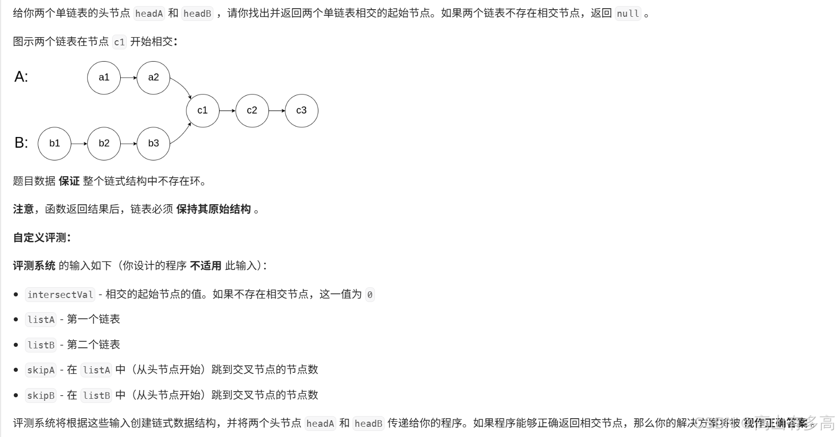 {//如果两个链表相交则链表的尾节点必然相同ListNode * pcura=headA;ListNode * pcurb=headB;int lena=1,lenb=1;while(pcura->next){pcura=pcura->next;lena++;}while(pcurb->next){pcurb=pcurb->next;lenb++;}if(pcura!=pcurb) return NULL;//利用假设法判断a,b的链表长度int gap=abs(lenb-lena);ListNode * longList=headA,* shortList=headB;if(lenb>lena){longList=headB;shortList=headA;}while(gap--){longList=longList->next;}while(longList != shortList){longList=longList->next;shortList=shortList->next;}return longList;