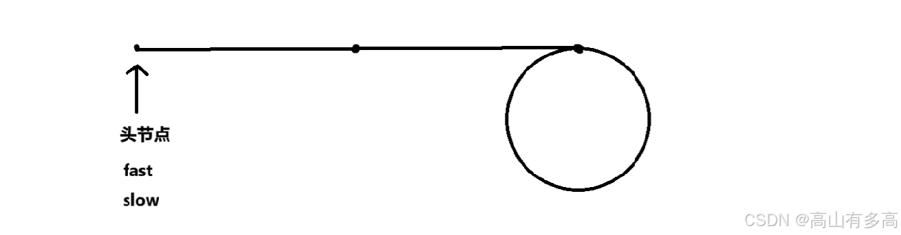 ②我们可以通过快慢指针的方式,让快指针:fast一次走两步,让慢指针:slow一次走一步,slow指针刚进入环的时候,就是我们寻求的环上第一个节点。