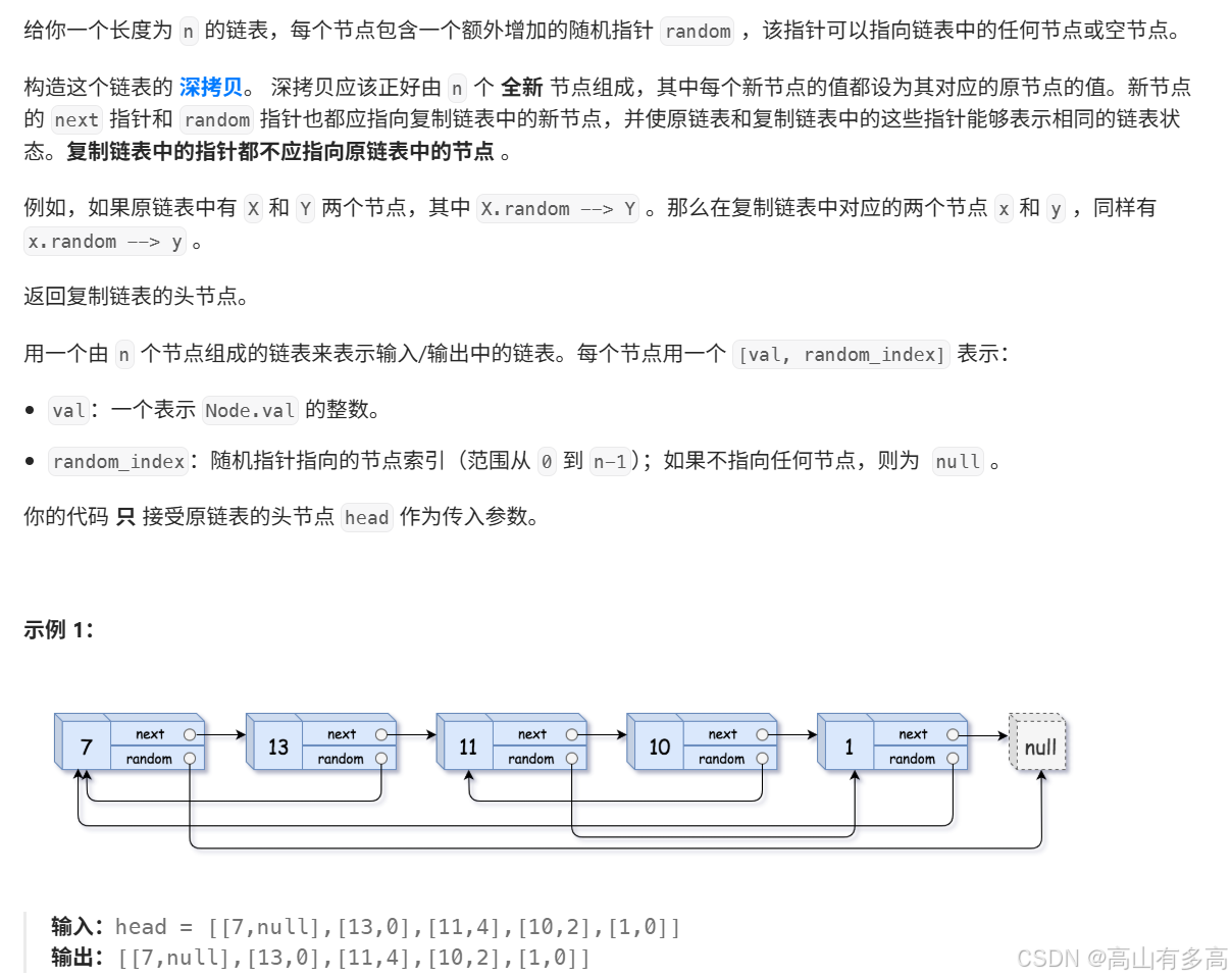 {if(head==NULL) return NULL;Node* pcur=head;//插入节点//在每个节点后面添加一个节点作为复制节点while(pcur){Node *newnode=(Node*)malloc(sizeof(Node));Node * tmp=pcur->next;pcur->next=newnode;newnode->val=pcur->val;newnode->next=tmp;pcur=newnode->next;}//核心环节//修改每个复制节点的random节点pcur=head;while(pcur){Node * copynode=pcur->next;//判断random节点是否为空if(pcur->random==NULL)copynode->random=NULL;elsecopynode->random=pcur->random->next;pcur=copynode->next;}//尾插节点//拆除复制节点pcur=head;Node * dummy=(Node*)malloc(sizeof(Node));Node * ptail=dummy;while(pcur){Node * copynode=pcur->next;ptail->next=copynode;ptail=copynode;pcur->next=copynode->next;pcur=copynode->next; }Node * ret=dummy->next;free(dummy);dummy=NULL;return ret;