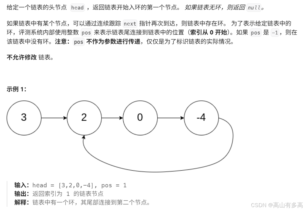 {ListNode * fast=head, * slow=head;ListNode * meet=NULL;//定义一个快指针,一个慢指针//快慢指针相遇,如果链表中无环meet=NULLwhile(fast && fast->next){fast=fast->next->next;slow=slow->next;if(slow==fast){meet=slow;break;}}//定义一个指针从头节点开始走ListNode * start=head;//两个指针相遇的节点就为环入口节点,保证meet不为空指针while(start != meet && meet){meet=meet->next;start=start->next;}return meet;