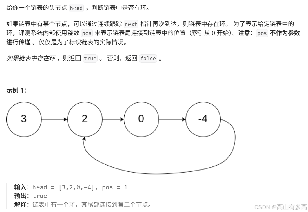 {ListNode * fast=head, * slow=head;//如果fast或则fast->next已经是NULL说明此时单链表没有带环 while(fast && fast->next){ //慢指针走一步,快指针走两步//两者一定会在环内相遇 slow=slow->next; fast=fast->next->next; if(fast==slow){return true;} }return false;