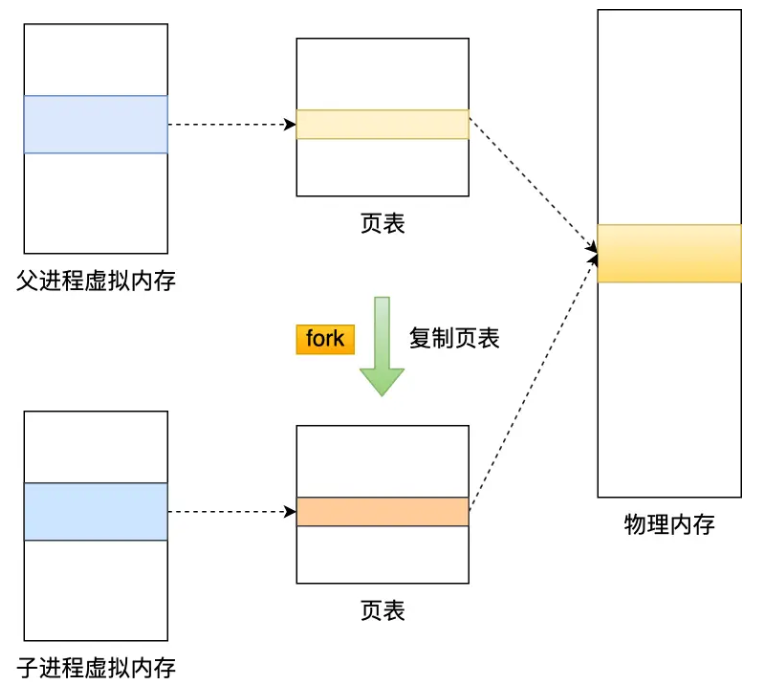 父进程在调用子进程时,操作系统会把父进程的页表复制一份给子进程,页表中记录了虚拟地址和物理地址的唯一映射关系,两者虚拟空间不同,但物理空间相同,而且此时进程的权限为只读