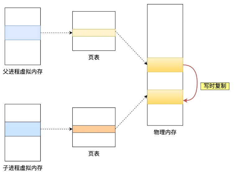 操作系统利用 Copy-On-Write(写时复制)机制确保父子进程对同一内存页共享,直到某一方写入时才真正复制页面