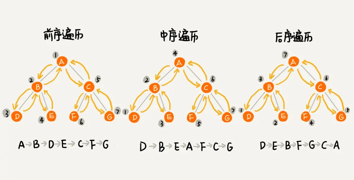 如何将所有节点都遍历打印出来呢?经典的方法有三种,前序遍历、中序遍历和后序遍历。其中,前、中、后序,表示的是节点与它的左右子树节点遍历打印的先后顺序。