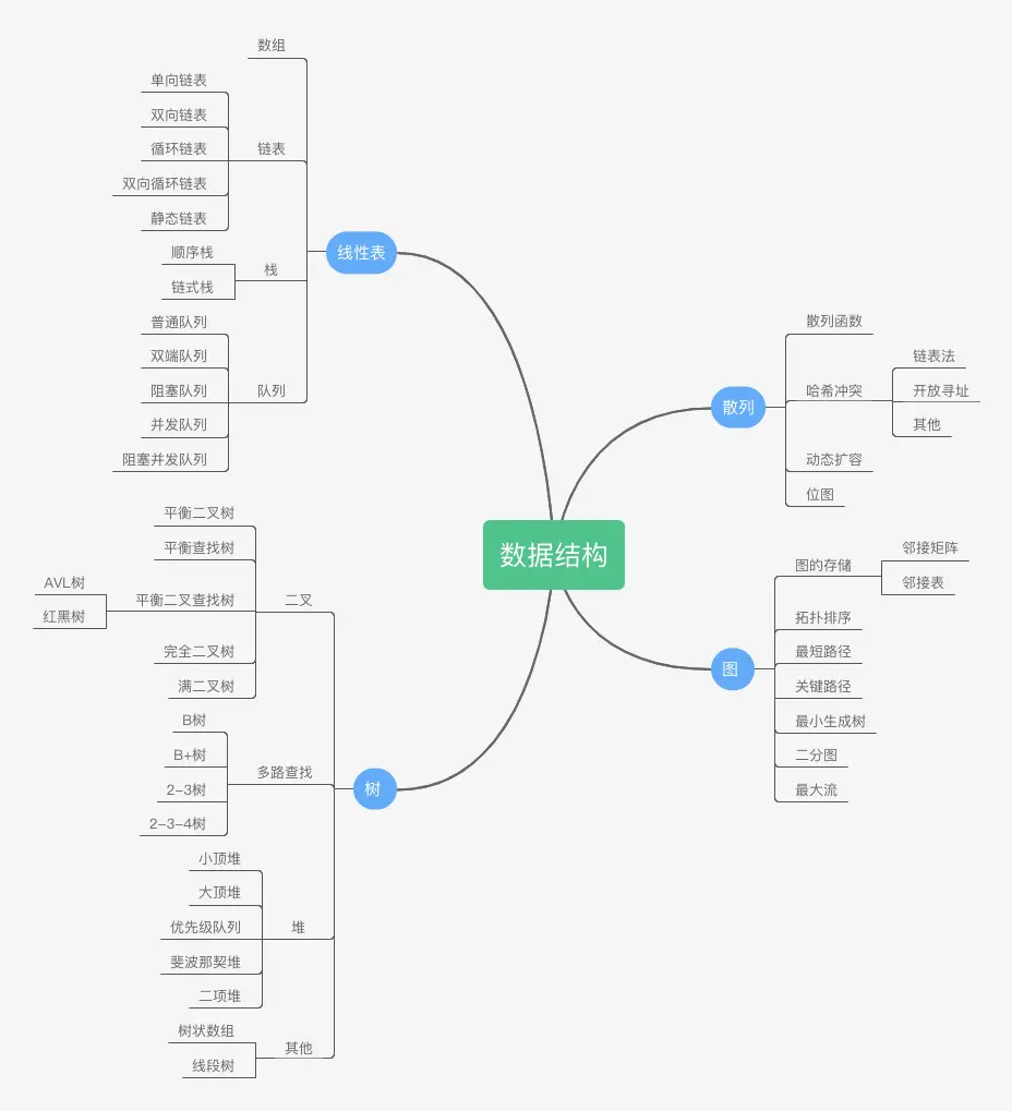 常见的数据结构在类型上包括:线性表,散列,树和图.