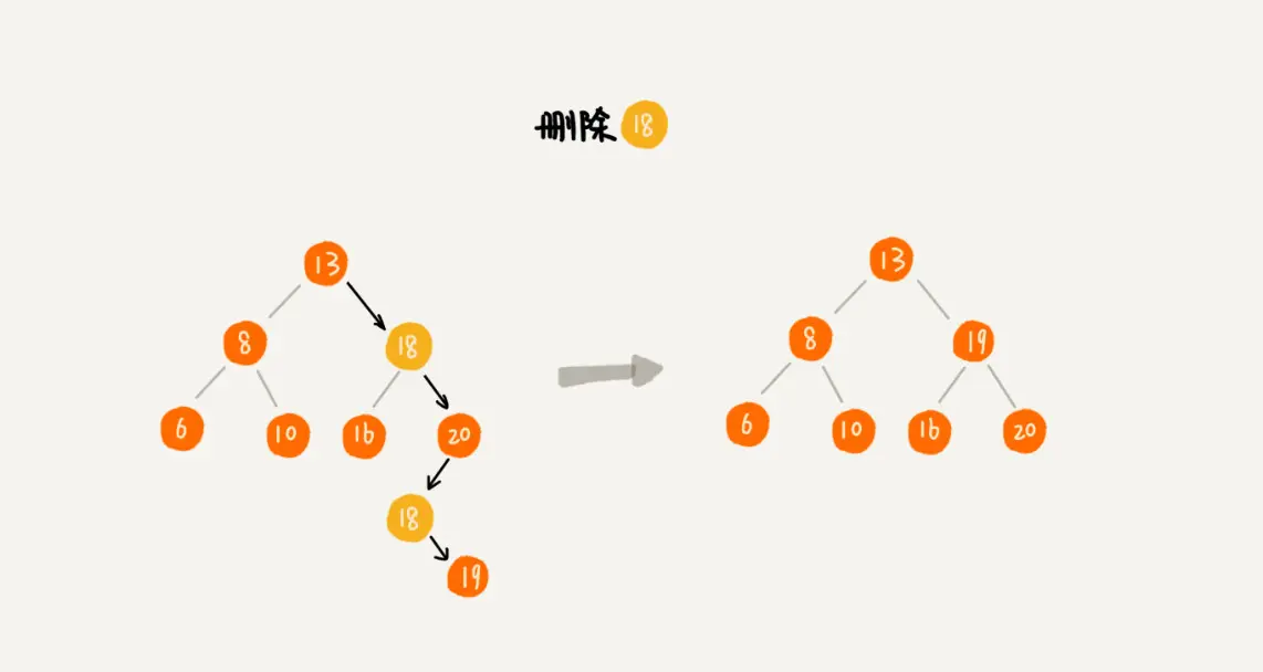 第三种情况是,如果要删除的节点有两个子节点,这就比较复杂了。我们需要找到这个节点的右子树中的最小节点,把它替换到要删除的节点上。然后再删除掉这个最小节点,因为最小节点肯定没有左子节点(如果有左子结点,那就不是最小节点了),所以,我们可以应用上面两条规则来删除这个最小节点。比如图中的删除节点 18。