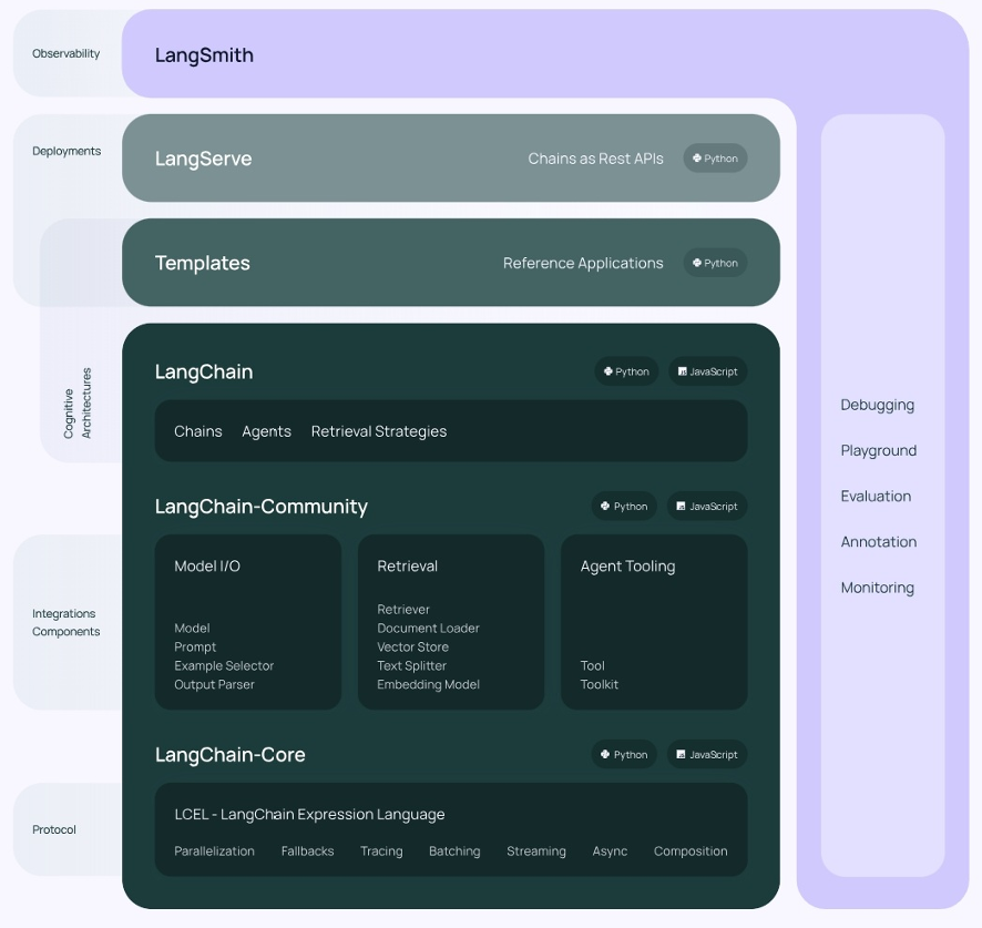 上图中展示了 LangChain 生态系统的主要组件及其分类,分为三个层次:架构(Architecture)、组件(Components)、部署(Deployment)