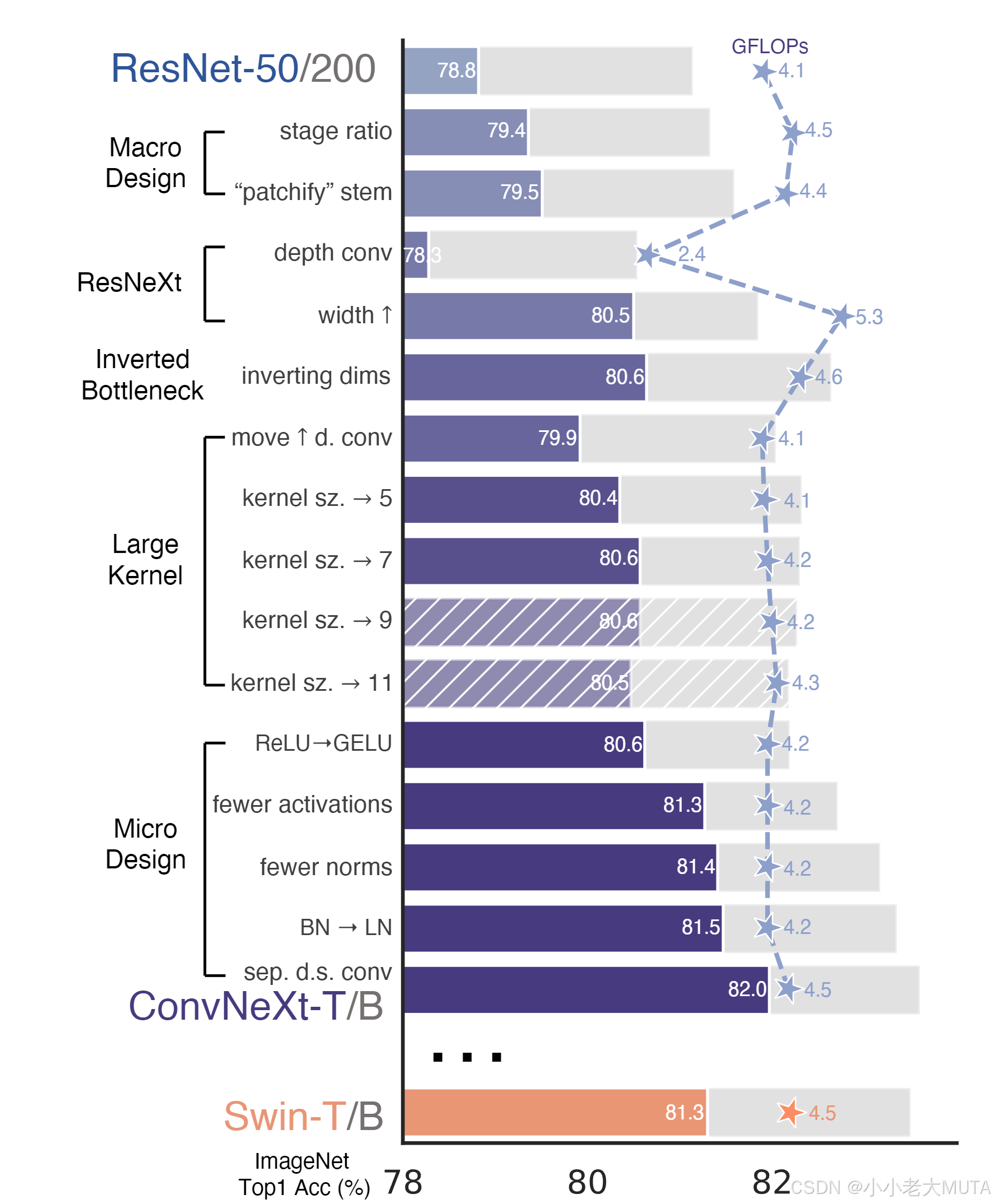 尽管这种改动使得深度可分离卷积层的FLOPs有所增加,但由于在下采样残差块中的shortcut 1×1卷积层FLOPs大幅减少,整体网络的FLOPs降至4.6G。有趣的是,这项改动使性能略有提升(从80.5%提升到80.6%)。在ResNet-200 / Swin-B规模下,这一步带来更显著的提升(从81.9%提升到82.6%),同时FLOPs也有所减少。因此,接下来我们将采用倒置瓶颈结构。
