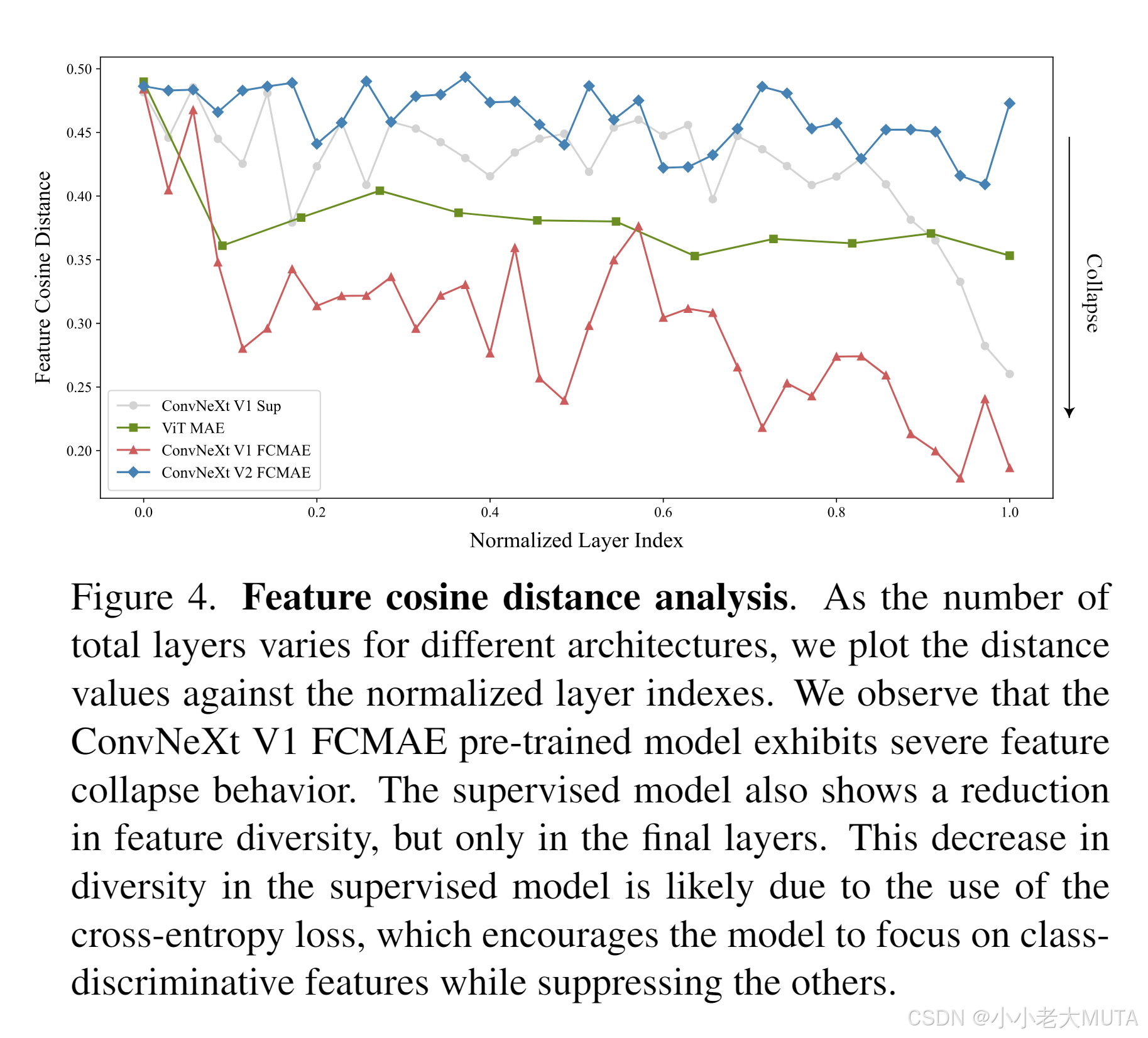 这张图展示了不同模型在各层的“特征余弦距离”(即特征多样性)变化趋势。纵轴是特征余弦距离,横轴是归一化后的层索引(从网络的头部到尾部)。特征余弦距离越高,表示该层不同通道之间的特征越多样化;距离越低,表示特征越相近,甚至出现特征塌缩。图中的曲线分别代表不同模型和训练方式: