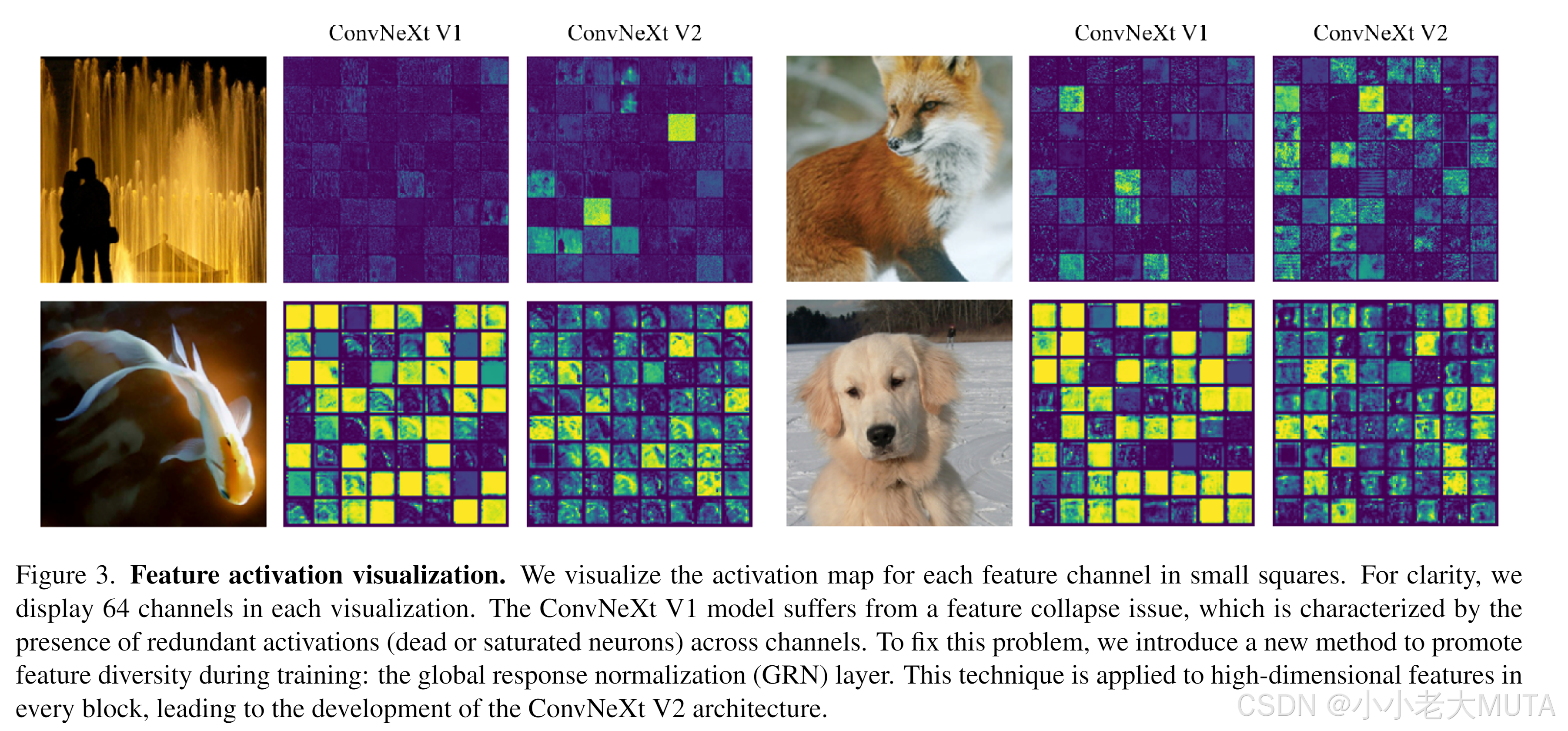 图3 特征激活可视化。将每个特征通道的激活图以小方块形式进行展示。为了清晰起见,每个可视化图中展示64个通道。ConvNeXt V1模型存在特征塌缩问题,其表现为不同通道间存在大量冗余激活(即死神经元或饱和神经元)。