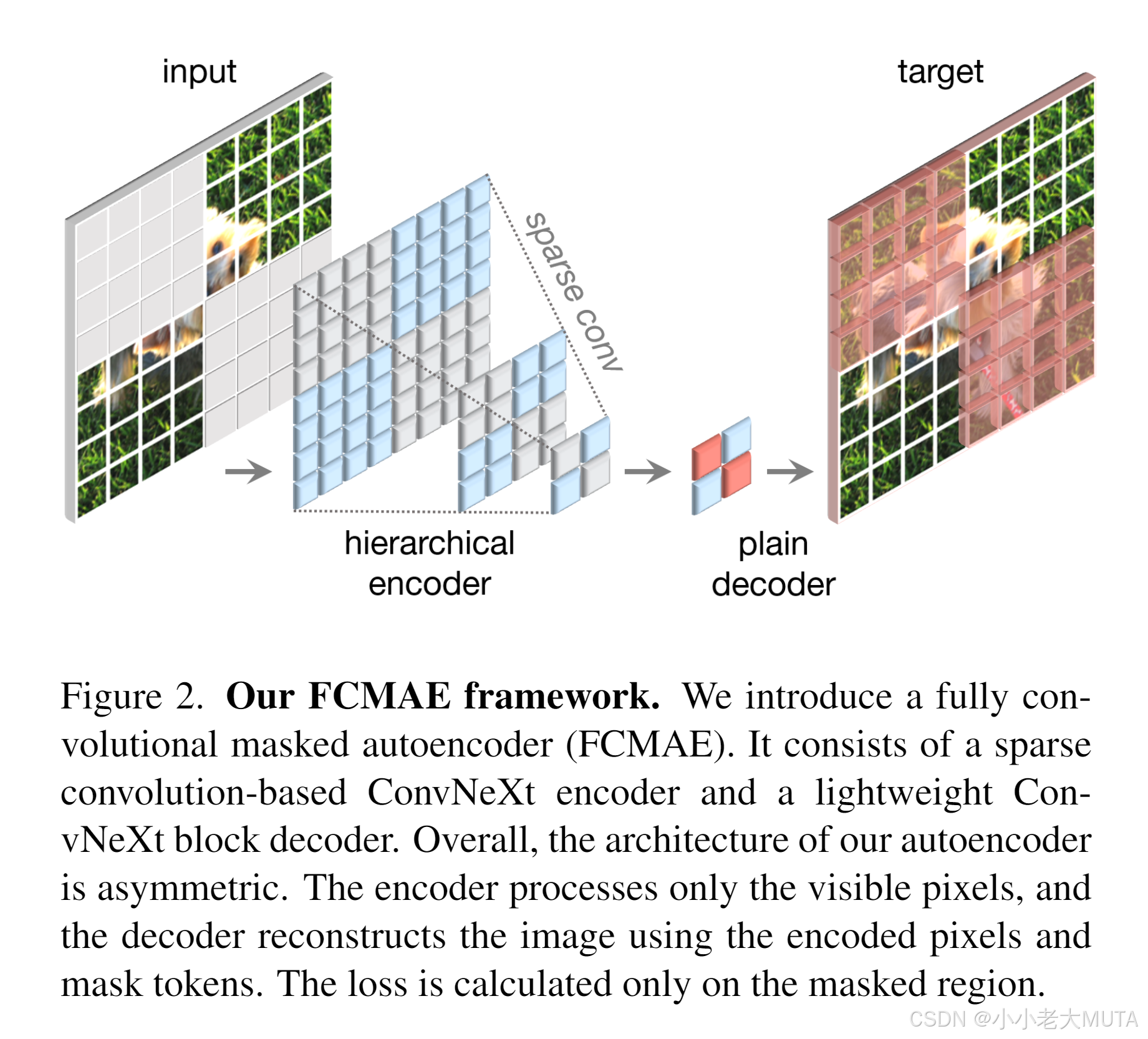 针对该问题,我们的新见解是将掩码图像视为“稀疏数据”,灵感来源于3D任务中稀疏点云学习[15,76]。我们的关键观察是掩码图像可表示为二维稀疏像素数组。基于此,合理引入稀疏卷积以辅助掩码自编码器预训练。