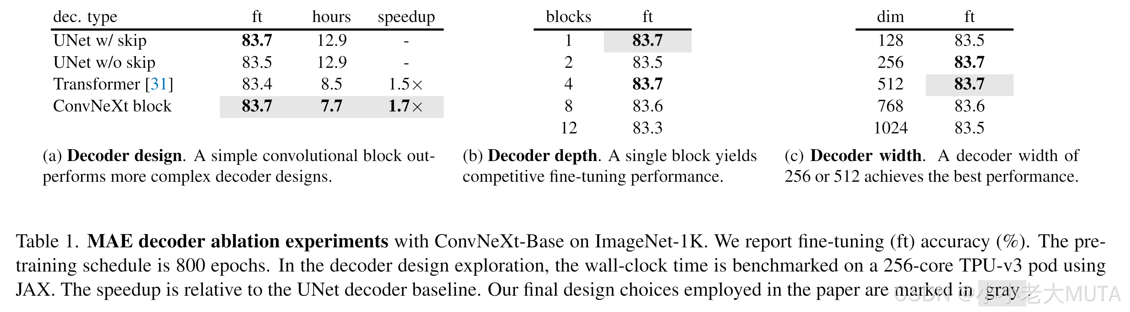 虽然有层次解码器[48,59]或Transformer解码器[21,31]等更复杂方案,但简化的单块ConvNeXt解码器在微调准确率表现良好,且大幅降低预训练时间(见表1)。解码器维度设为512。