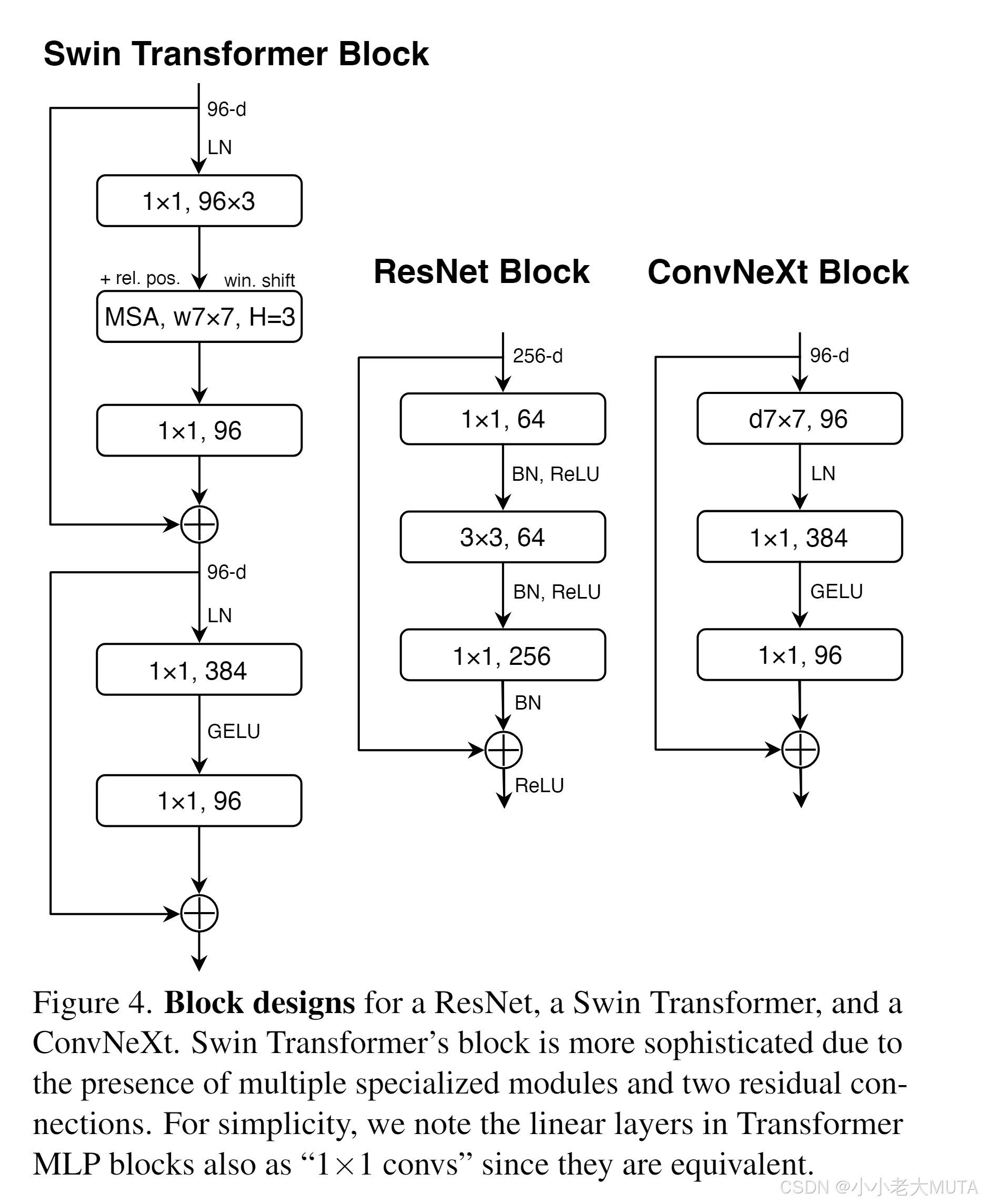 Vision Transformer通常采用更激进的“patchify”策略作为stem,即较大的卷积核(如14或16),无重叠。Swin Transformer的patchify层patch size为4,以适应其多阶段设计。