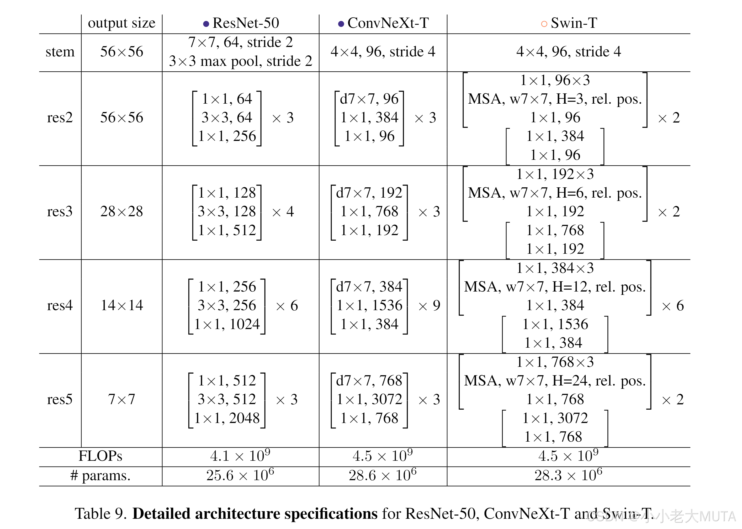 参考该设计,我们将ResNet-50各阶段的模块数从(3, 4, 6, 3)调整为(3, 3, 9, 3),也使FLOPs与Swin-T保持一致。