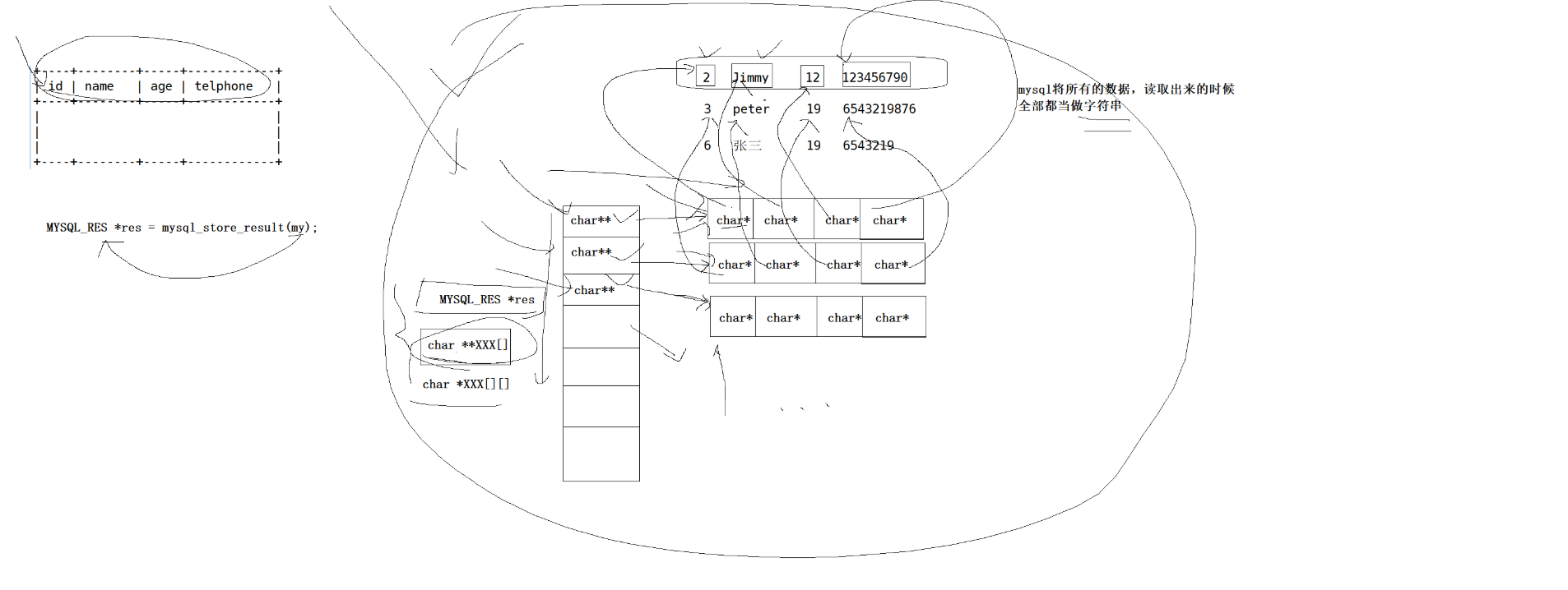 函数的返回值为MYSQL_RES* 类型,是一个结构体指针类型,保存了查询结构和相关属性,如下图,每一个char* 都指向表的一个内容,所以要查看表的内容,就需要遍历所有元素,打印出内容。