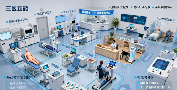 2.专项技能实训区:细分康复理疗、营养配餐、健康评估等子区域,配备针灸模拟仪、膳食分析系统等专业设备,针对性提升专项技能。