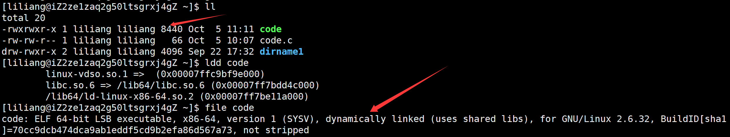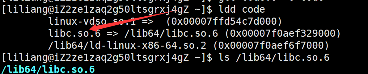 那么这张图片是由code.c或者源文件经过编译形成的可执行文件。那么咱们ldd这个可执行文件,就可以看出这个可执行文件依赖的是什么库。可以看出,依赖的是libc.so.6这个库,(因为这个code.c文件中有c语言函数。所以自然的也得依赖c语言库)