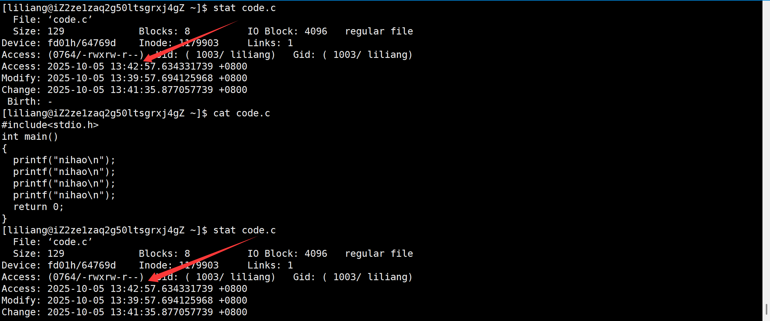 但是你实践就会发现,没有改变Access,为什么呢?因为你更新时间——修改文件属性——刷新磁盘保存起来——cat次数多了,访问文件的次数也变多了——增加访问磁盘的次数——导致磁盘的效率降低——导致Linux操作系统整体效率下降(所以说,访问文件,得到一定的次数之后,才会改变Access)。而这个次数又与操作系统内核有关。