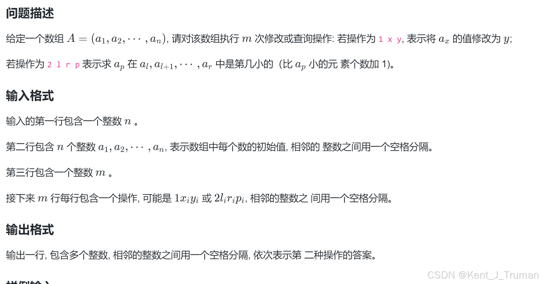 {int n;cin >> n;for(int i = 1; i <= n; i++)cin >> a[i];L = sqrt(n + 1);for(int i = 1; i <= n; i += L) //只保证了左边界不越界{bcnt++;bl[bcnt] = i;br[bcnt] = min(i + L - 1, n); //这是分块最容易错误的点,就是没有考虑右边界越界for(int j = bl[bcnt]; j <= br[bcnt]; j++)bs[bcnt].push_back(a[j]), id[j] = bcnt; //想直接用下标访问未初始化的向量,需要resize}for(int i = 1; i <= bcnt; i++)sort(bs[i].begin(), bs[i].end());int m;cin >> m;for(int i = 1; i <= m; i++){int op;cin >> op;if(op == 1){int x, y;cin >> x >> y;int t = a[x];a[x] = y;int bid = id[x];auto it = lower_bound(bs[bid].begin(), bs[bid].end(), t);*it = y;sort(bs[bid].begin(), bs[bid].end());}else if(op == 2){int l, r, p;cin >> l >> r >> p;int cnt = 0;if(id[l] == id[r]){for(int j = l; j <= r; j++)if(a[j] < a[p]) cnt++;}else{for(int j = id[l] + 1; j < id[r]; j++){auto it = lower_bound(bs[j].begin(), bs[j].end(), a[p]);if(it == bs[j].end()) cnt += br[j] - bl[j] + 1;else cnt += (it - bs[j].begin());}for(int j = l; j <= br[id[l]]; j++)if(a[j] < a[p]) cnt++;for(int j = bl[id[r]]; j <= r; j++)if(a[j] < a[p]) cnt++;}cout << cnt + 1 << ' ';}}