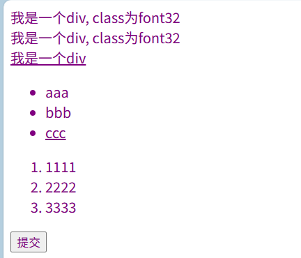 <div class="font32">我是⼀个div, class为font32</div><div class="font32">我是⼀个div, class为font32</div><div><a href="#">我是⼀个div</a></div><ul><li>aaa</li><li>bbb</li><li><a href="#">ccc</a></li></ul><ol><li>1111</li><li>2222</li><li>3333</li></ol><button id="submit">提交</button>
