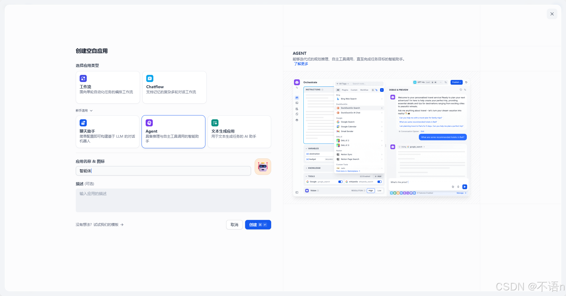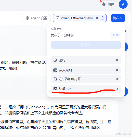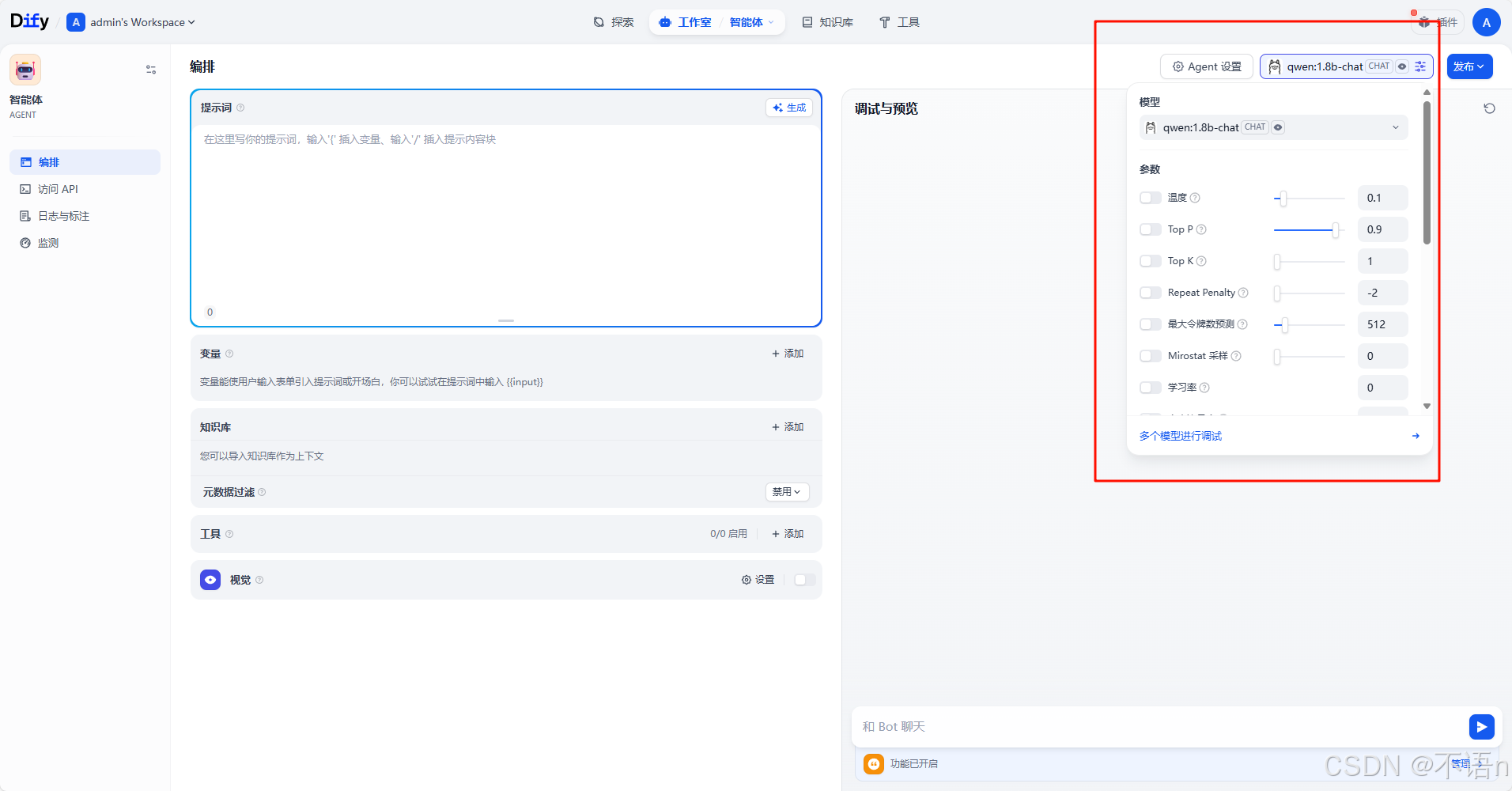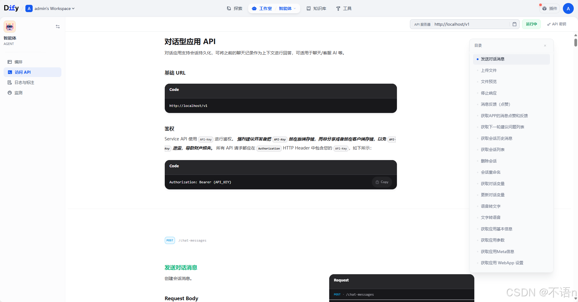 import requests import json# ========== 配置信息 ========== API_URL = "http://192.168.*.*:5001/v1/chat-messages" # Dify API 地址 API_KEY = "API Key" # 替换成你在 Dify 里复制的 App API Key# ========== 主函数 ========== def ask_dify(question):"""向 Dify 发送请求并返回回答"""headers = {"Authorization": f"Bearer {API_KEY}","Content-Type": "application/json"}data = {# inputs 的字段要和你 Dify 应用的输入参数匹配"inputs": {"question": question},"query": question,"response_mode": "blocking","user": "orangepi"}try:response = requests.post(API_URL, headers=headers, json=data, timeout=30)if response.status_code == 200:result = response.json()return result.get("answer", " Dify 没有返回 answer 字段。")else:return f"请求错误:{response.status_code}\n{response.text}"except Exception as e:return f" 出错: {e}"# ========== 循环交互 ========== def main():print("Dify 智能聊天已启动(输入 exit 或 quit 退出)")while True:question = input("你:").strip()if question.lower() in ["exit", "quit"]:print("👋 再见!")breakanswer = ask_dify(question)print(f"Dify:{answer}\n")if __name__ == "__main__":main()