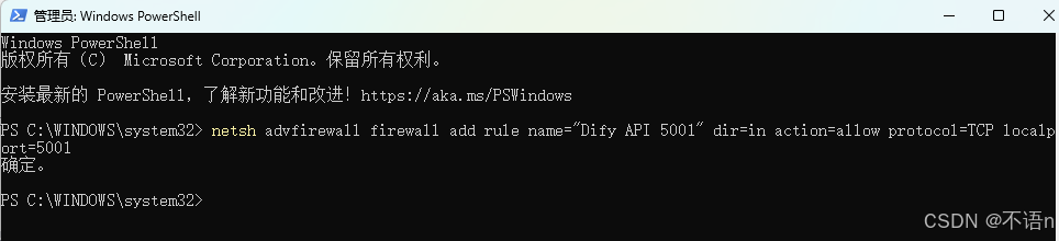 netsh advfirewall firewall add rule name="Dify API 5001" dir=in action=allow protocol=TCP localport=5001